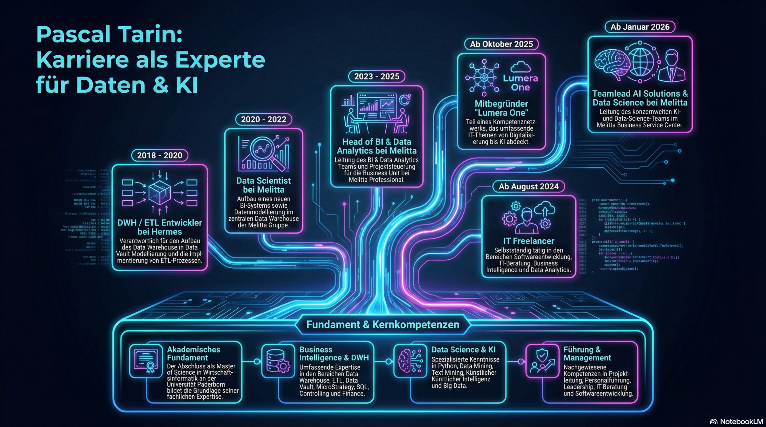 Meine Stärke liegt darin, technische Expertise mit analytischem Denken und konzeptionellen Fähigkeiten zu verbinden. Ich gestalte Projekte effizient, führe Teams zielgerichtet und sorge dafür, dass Datenprojekte echten Mehrwert liefern – verständlich, praxisnah und auf die Bedürfnisse der Menschen im Unternehmen zugeschnitten.