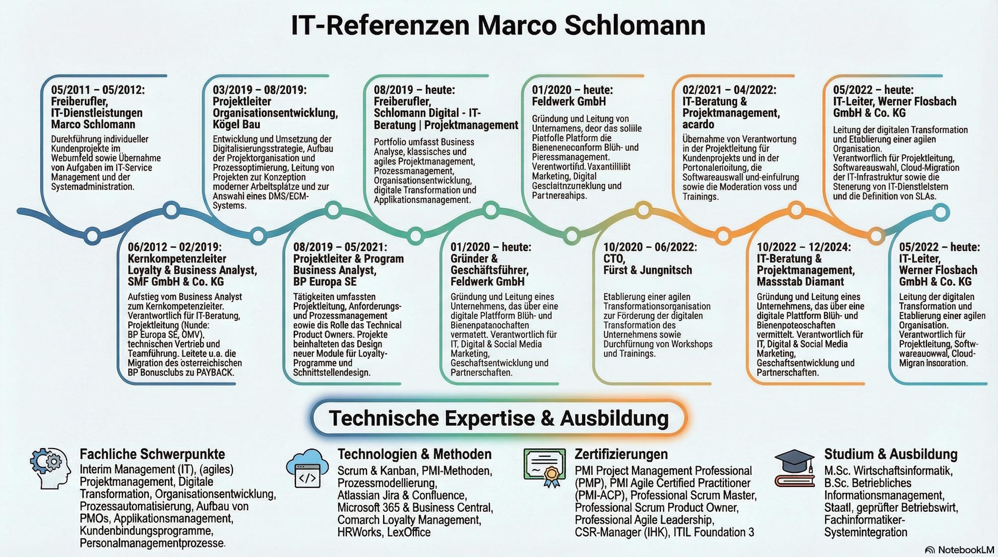 Gute IT-Beratung gibt es nicht von der Stange, es ist wichtig sich immer auf die jeweilige Situation und das Unternehmen einzulassen und die dort arbeitenden Menschen zu berücksichtigen. Betrachtung kleiner Details, über den Tellerand blicken und gezielte Fragen stellen, damit die bestmöglichste Lösung etabliert werden kann. Ich biete über 19 Jahre Erfahrung in verschiedenen Branchen und Bereichen. Strukturierte, verantwortungsvolle und kundenorientierte Beratung, gepaart mit ausgeprägten analytischen und konzeptionellen Fähigkeiten, immer den Menschen im Blick. Neben meiner Firma Schlomann Digital, bin ich noch Mitgründer der Firma Feldwerk. Wir betreiben ein Nachhaltigkeitsprojekt zur Sicherung der Artenvielfalt und dem Schutz unserer Natur.